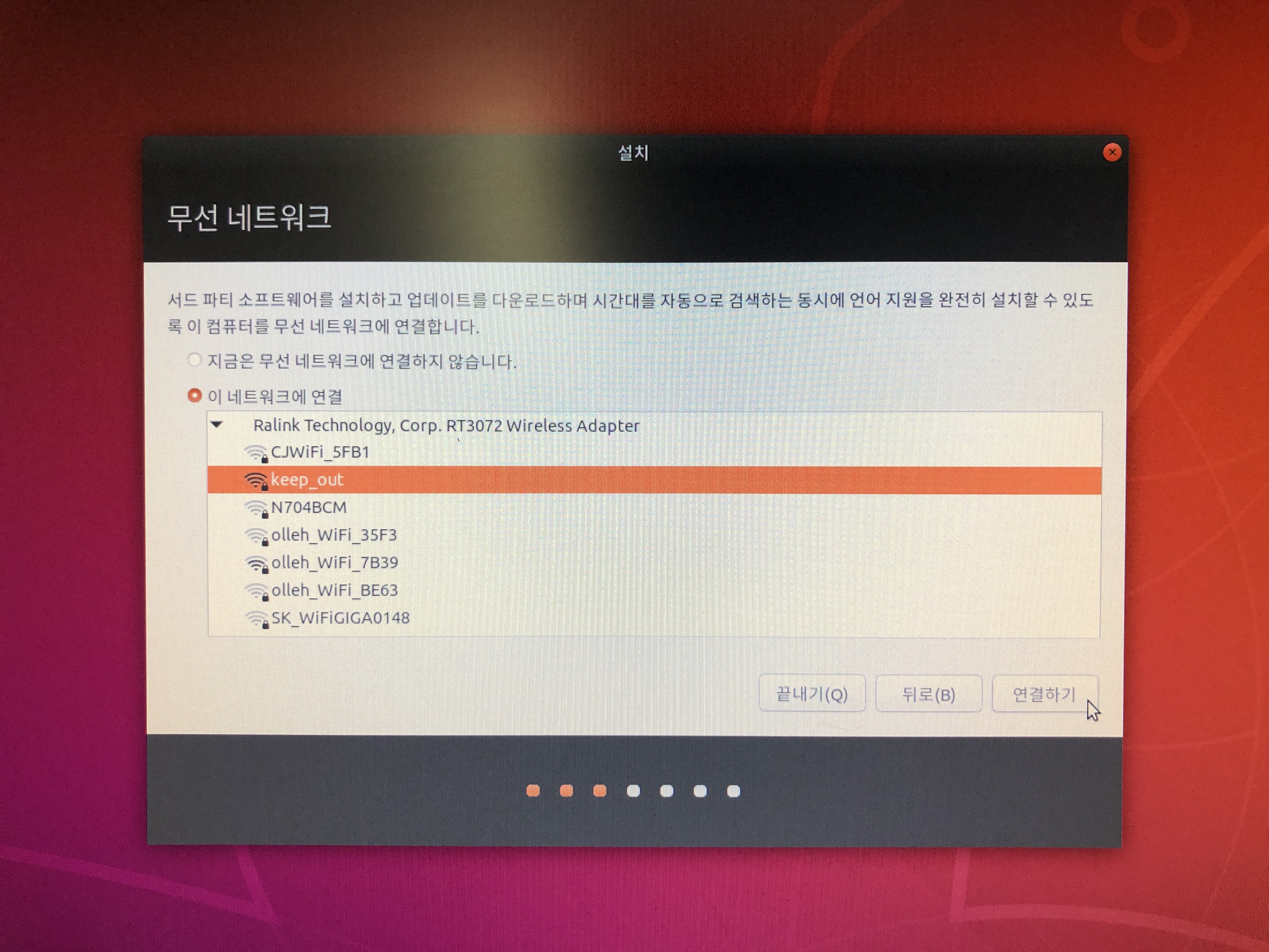 무선 네트워크도 바로 잡아서 연결할 수 있습니다. (유선이면 생략 가능)