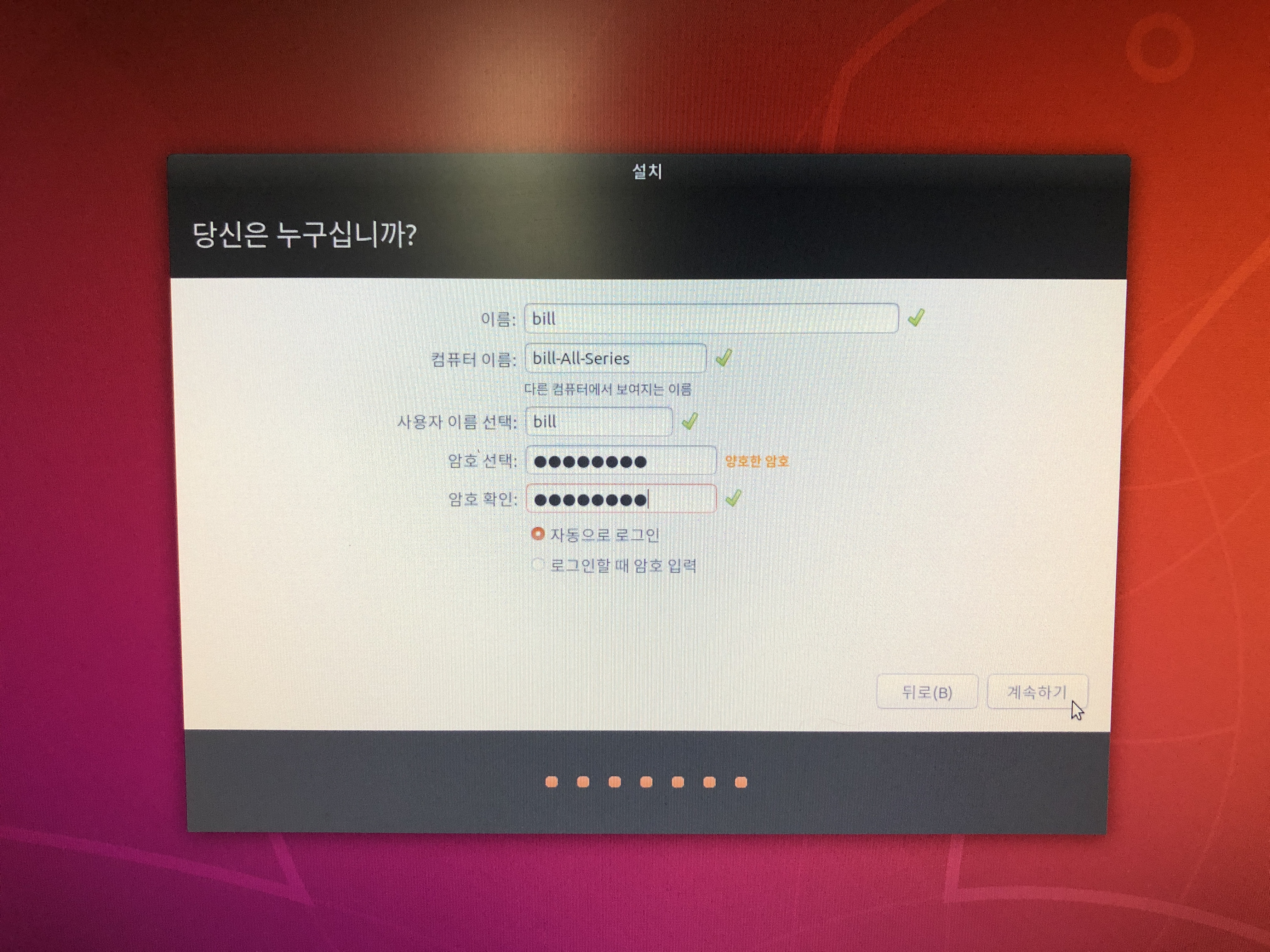 컴퓨터, 사용자 이름, 비밀번호 등을 입력합니다. 컴퓨터를 켤때마다 암호를 입력하기 귀찮다면 자동으로 로그인을 선택하는 것이 좋습니다.