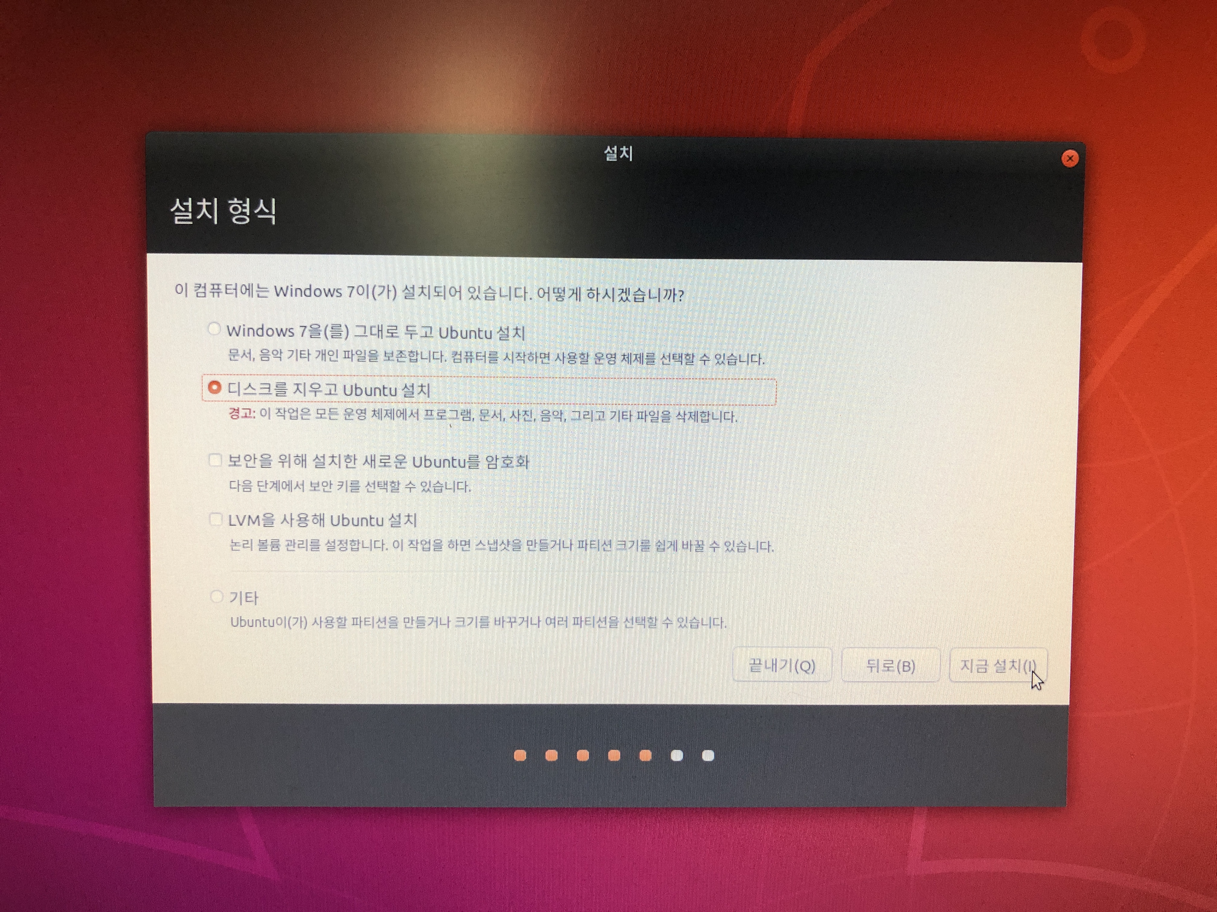 윈도우와 듀얼 부팅도 가능하지만 저는 우분투 전용PC를 만들기 위해 디스크를 지우고 Ubuntu 설치를 선택했습니다. 암호화, 논리 볼륨, 파티션 관련 옵션도 있는데 집에서 막쓰는 인터넷 PC라면 선택할 필요가 없습니다. 선택이 끝났다면 지금 설치를 클릭합니다.
