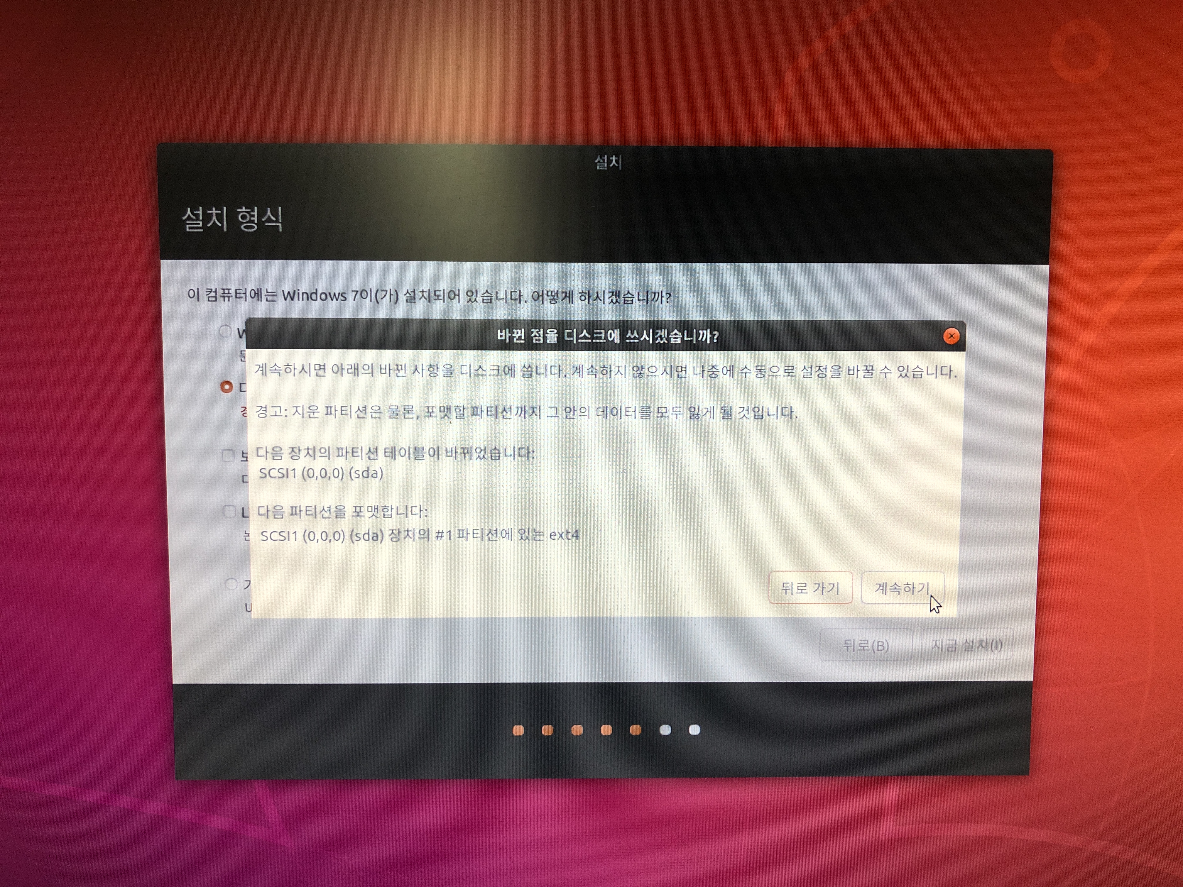 기존 데이터가 삭제된다는 경고 메시지가 나오는데 그냥 계속하기를 클릭.