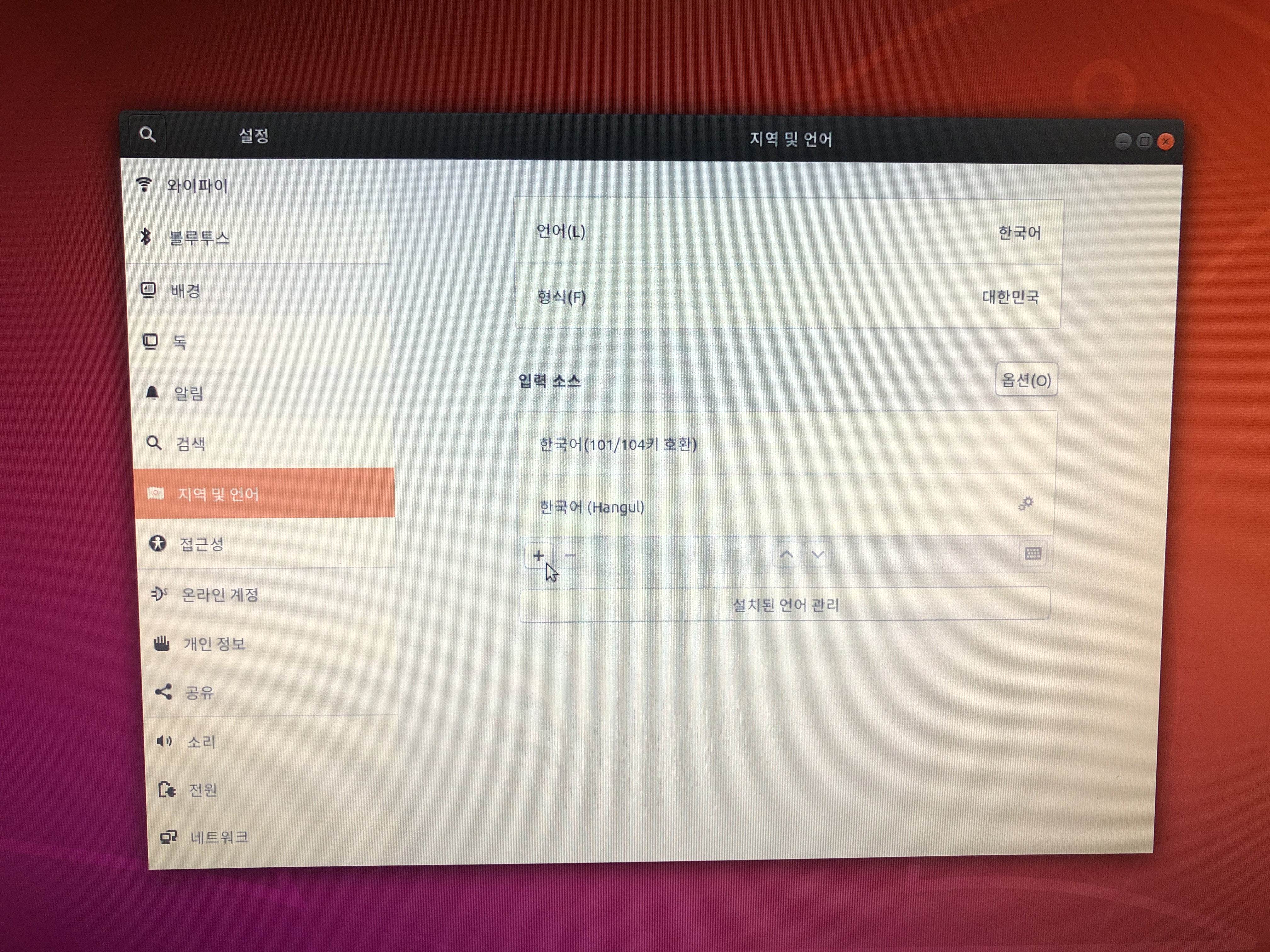 만약 키보드 레이아웃(입력소스)을 변경할 수 없을 경우 설정 - 지역 및 언어 - 입력소스에서 플러스(+) 버튼을 눌러 입력소스를 추가하면 됩니다.